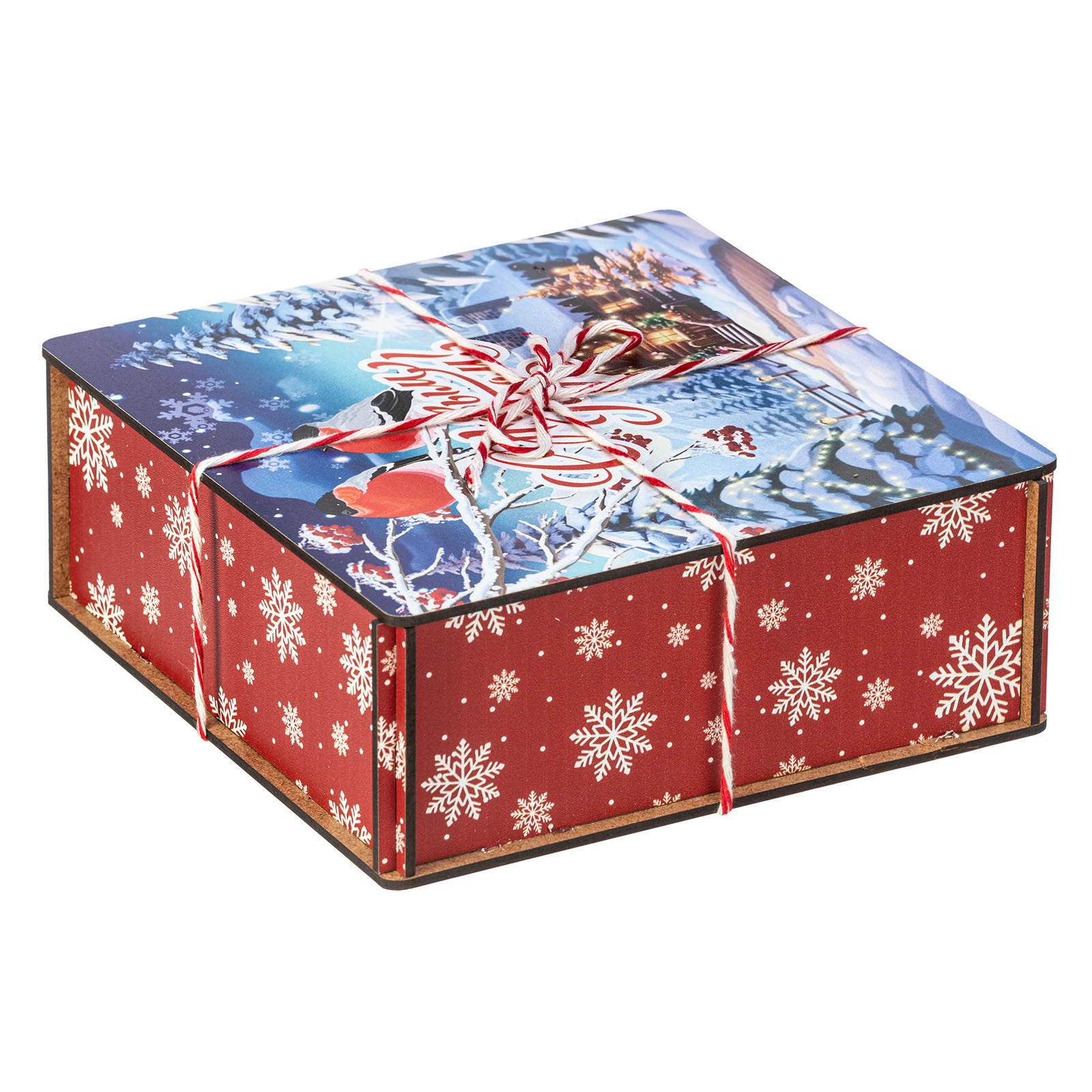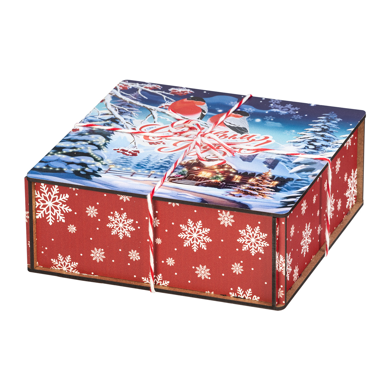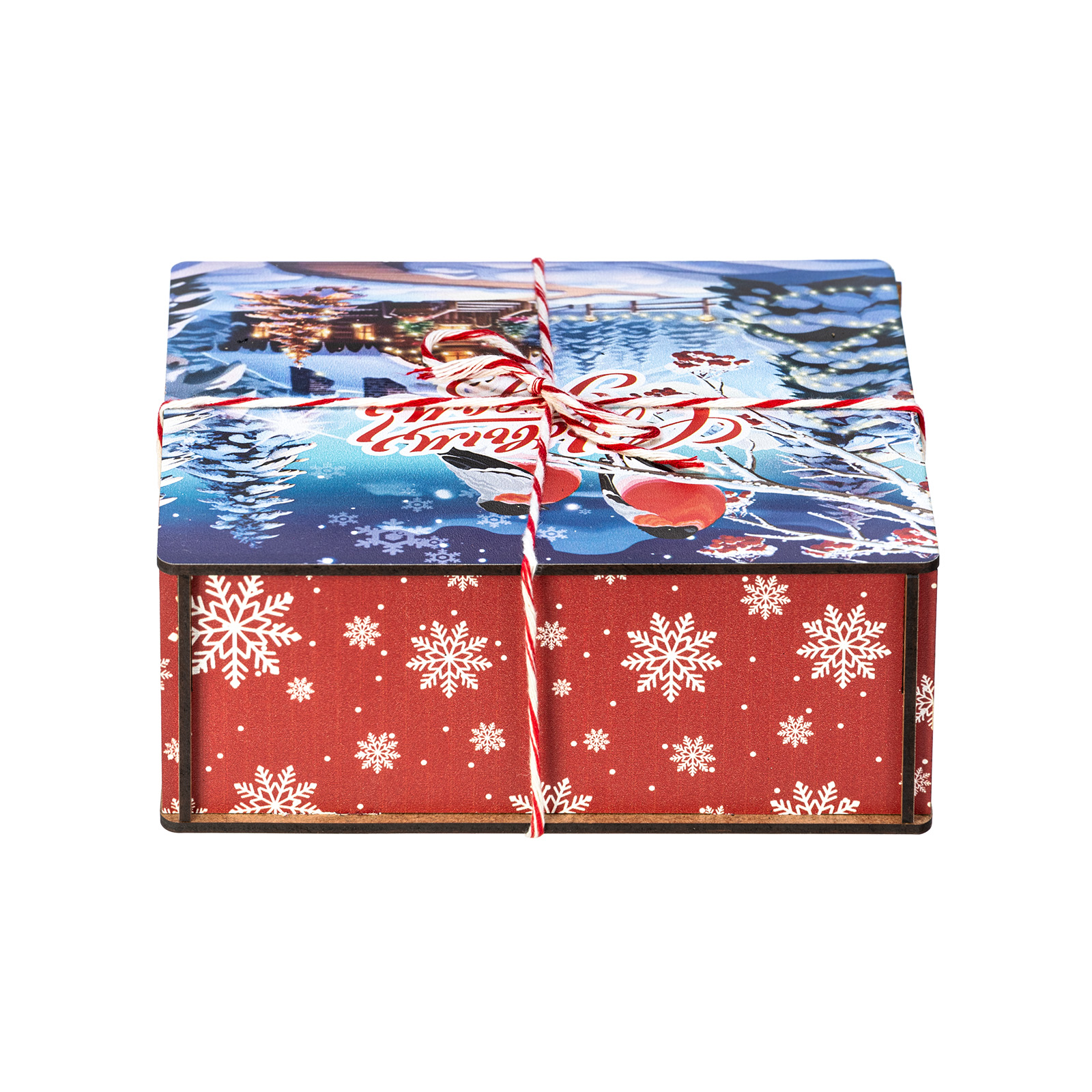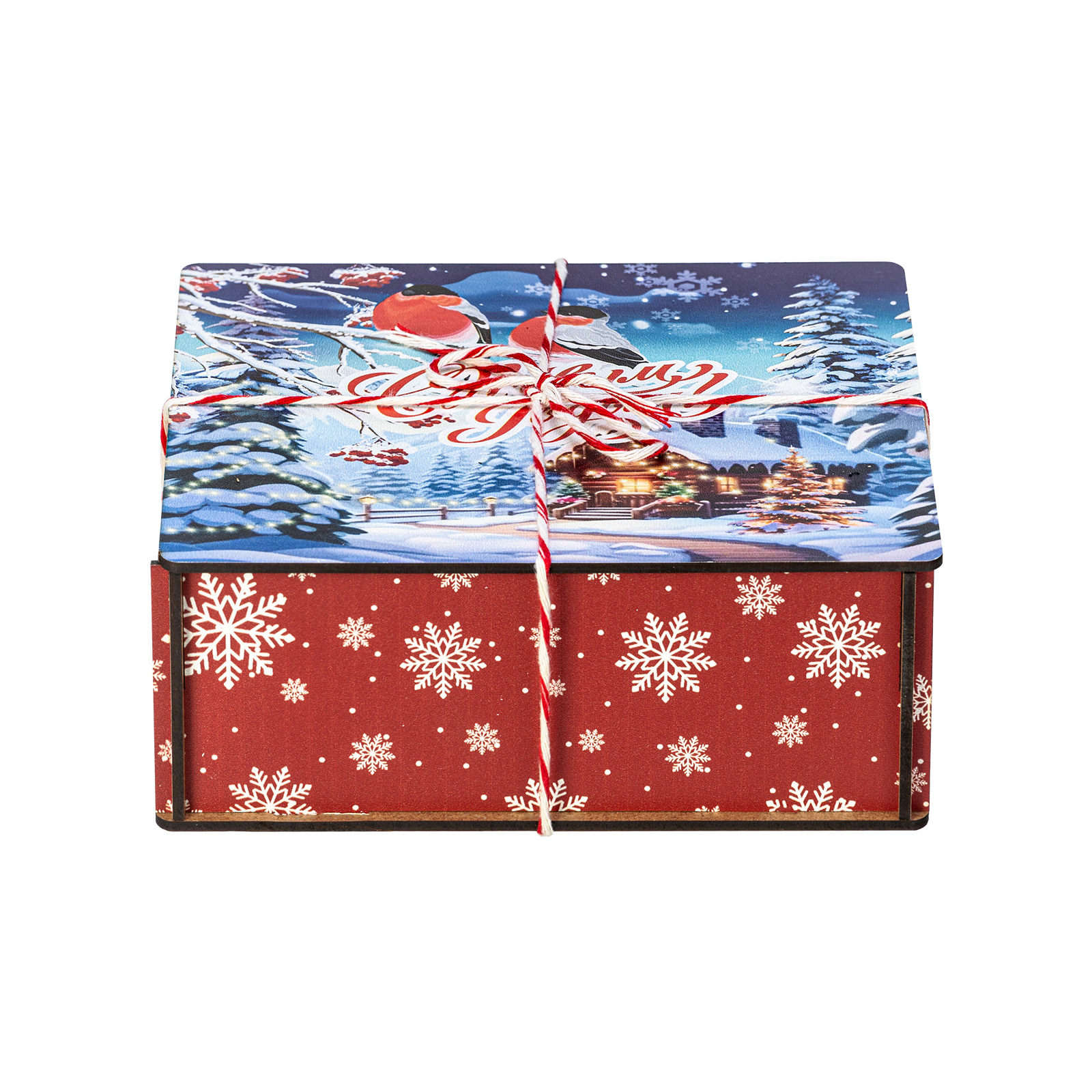 Сладкие подарки в деревянных упаковках - это сочетание оригинальности и безупречного вкуса сладостей. Набор “Январские птицы”  идеально подходит в качестве презента сластене любого возраста. Это деревянный ящичек размером 18х18х7, перетянутый праздничной веревкой-шнурком. На крышке ящика изображена завораживающая иллюстрация в виде заснеженной зимней деревни, а на переднем плане красуются главные герои - красногрудые красавцы-снегири, гордо сидящие на еловой веточке. В состав подарка входит 600 грамм вкусных разнообразных сладостей от ведущих кондитерских предприятий страны, а также небольшой памятный сувенир, который еще долго будет сохранять в себе атмосферу новогодних праздников.